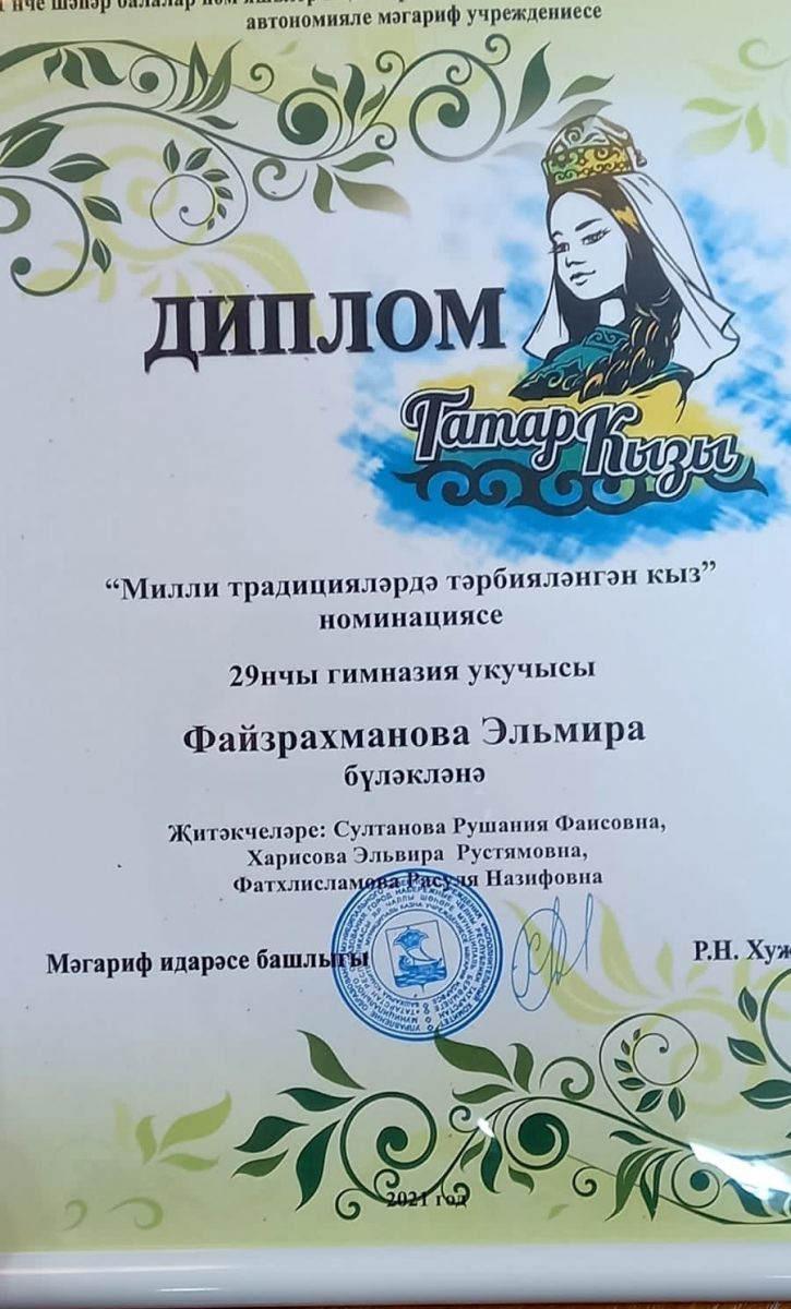 Гимназия укучысы Эльмира Файзрахманова " Милли традицияләрдэ тәрбияләнгэн кыз" номинациясендэ җинүче дип табылды.