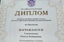 Рәсәйкүләм олимпиаданың региональ этабында биология фәненнән призёр гимназиябезнең 10 А класс укучысы Савзиханова Рената Рашид кызын котлыйбыз!