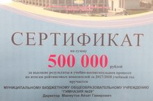 За высокие результаты в учебно-воспитательном процессе по итогам рейтинговых показателей за 2017-2018 учебный год нашей гимназии вручили СЕРТИФИКАТ на 500000 руб.