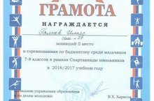 Галиев Ильяс занял 2 место в соревнованиях по бадминтону среди мальчиков в рамках Спартакиады школьников 2016-2017 учебный год
