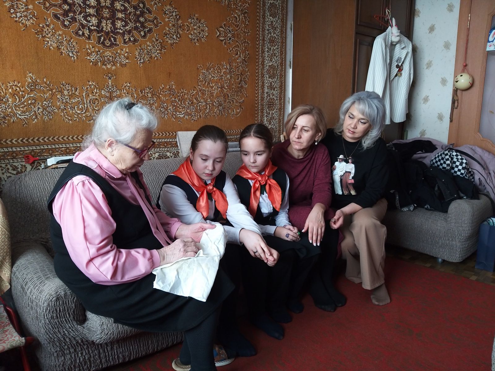 Сегодня делегация 29 гимназии : Тимуровский отряд 5б класса, зам. дир. по ВР Фасхутдинова Г.И., пед.орг.Харисова Э.Р, пред. ТОС Наумкина В.М. посетили подшефного ветерана, блокадницу Ленинграда - Колесову Нину Ивановну.