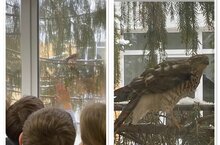 Ученики 2А класса уже готовят кормушки для птиц! Ребята каждый день с интересом наблюдают за дятлом, который прячет шишки. А сегодня к нам прилетал ястреб-перепелятник!