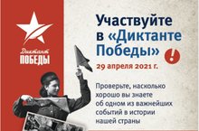 29 апреля 2021 года проводится Международный исторический диктант на тему событий Великой Отечественной войны – «Диктант Победы». Принять участие в Диктанте Победы-2021 можно в онлайн-режиме на сайте диктант победы.рф (пройти диктант онлайн можно в течение дня, 29 апреля 2021 года)