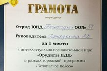 Поздравляем отряд ЮИД "Пешеходики" под руководством Гарифуллиной Алсу Вильсоровны с победой в интеллектуально-познавательной игре "Эрудиты ПДД" в рамках городской программы "Безопасное колесо".