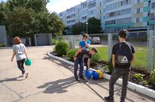 На территории нашей гимназии в летний период работает трудовая бригада школьников, которые устроились на работу через Центр Занятости и "Центр по трудоустройству учащихся и студенческой молодежи"