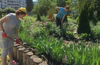 В летний период учителя гиманзии трудятся на пришкольном участке. Облагороженная территория, цветущие клумбы радуют жителей города.