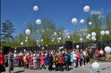 Гимназисты вместе с педагогами и родителями провели акцию «Спасибо Деду за Победу» на площади у мемориала «Родина мать». 350 белых шаров с именами погибших героев - родственников ВОВ взвились ввысь.