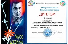 В Межрегиональных Джалиловских чтениях, проходивших в городе Казань, ученица гимназии Гайсина Лейла завоевала диплом 1 степени.