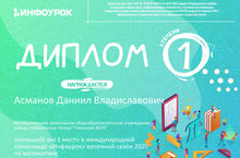 Во время дистанционного обучения не прекращается работа по подготовке к олимпиадам, развитию творческих и интеллектуальных способностей учащихся. Под руководством учителя математики Гульбиной Ф.А. учащиеся 7-х классов принимают участие в дистанционных олимпиадах олимпиадах и конференциях. Асманов Даниил, 7а, стал победителем весеннего сезона международной олимпиады по математике "Инфоурок" , Ивакин Михаил, 7в и Латыйпов Амир, 7в награждены дипломом 2 степени IX Всероссийского конкурса "Надежды России". Поздравляем!