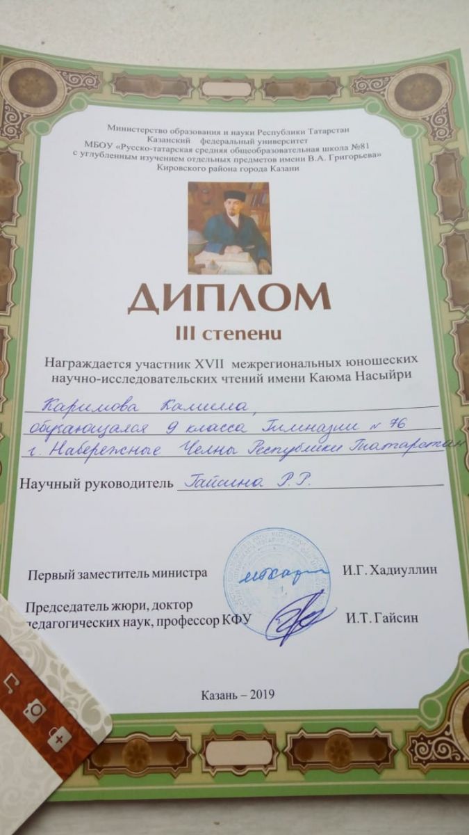 Поздравляем призера XVII межрегиональных юношеских научно-исследовательских чтений имени Каюма Насыйри 29.03.2019