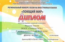 Ученица гимназии Имамова Эмилия приняла участие в ежегодном региональном конкурсе песни на иностранных языках и была удостоена диплома 2 степени. Подготовиться к конкурсу ей помогли: учитель английского языка Кондылева Марина Сергеевна и учитель музыки Кудашева Светлана Анисовна