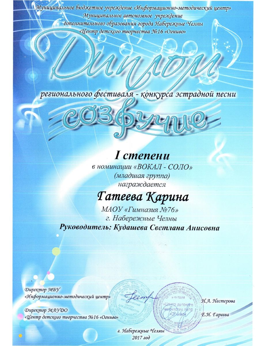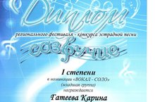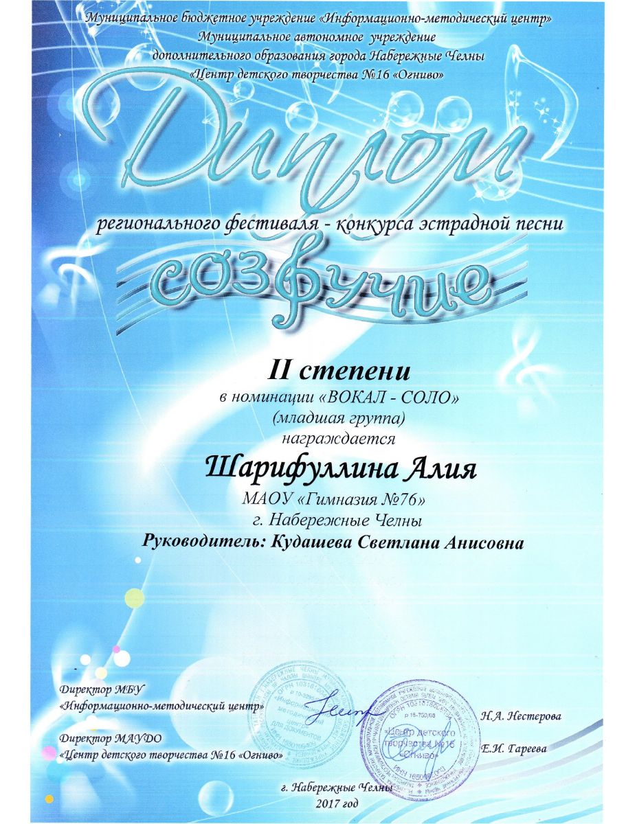 Гатеева Карина, ученица 2б класса завоевала диплм 1-й степени в номинации "вокал-соло" в региональном конкурсе "Созвучие", Шарифуллина Алия,ученица 3б класса, завоевала диплом 2-й степени. Подготовила талантливых участниц, учитель музыки Кудашева Светлана Анисовна. Желаем нашим музыкантам дальнейших творческих успехов.