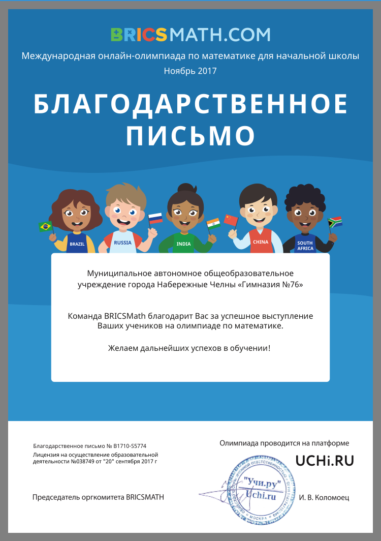 Учащиеся гимназии приняли активное участие в международной онлайн-олимпиаде по математике для начальной школы BRICSMath.