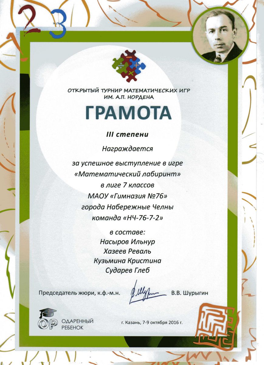 Грамота 3 степени 7 класс "Математический лабиринт"