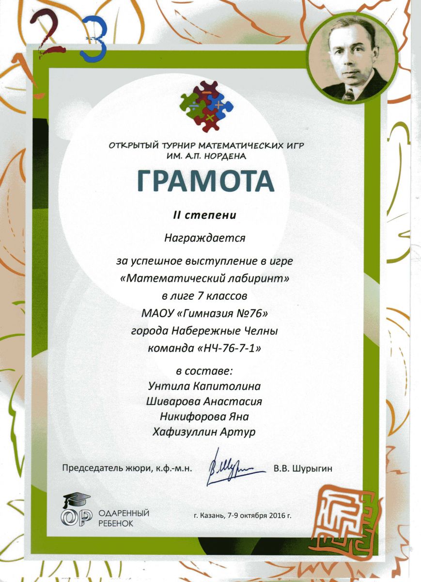 Грамота 2 стпени 7 класс "Математический лабиринт"