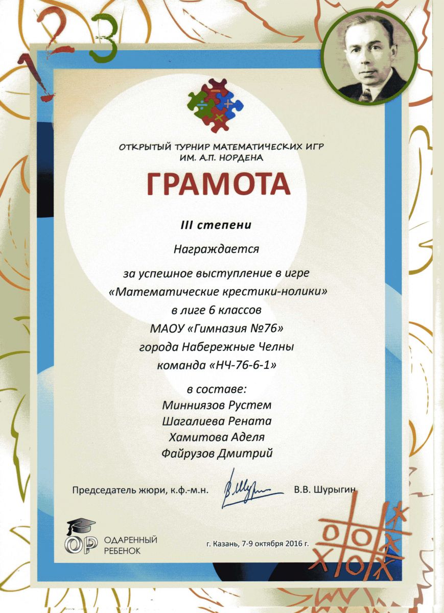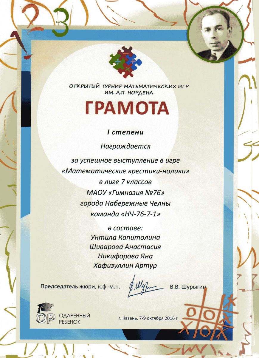 Грамота 1 степени 7 класс "Математические крестики-нолики"