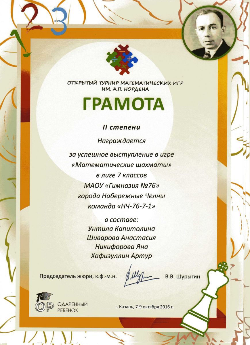 Грамота 2 степени 7 класс "Математические шахматы"