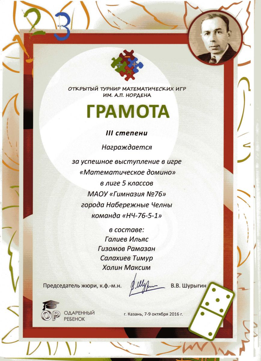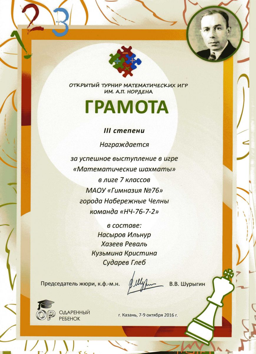 Грамота 3 степени 7 класс "Математические шахматы"