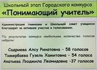 В гимназии прошел Школьный этап Городского конкурса "Понимающий учитель". По результатам конкурса наибольшее количество голосов набрала Алсу Ринатовна Садриева! Желаем ей успехов в городском этапе!