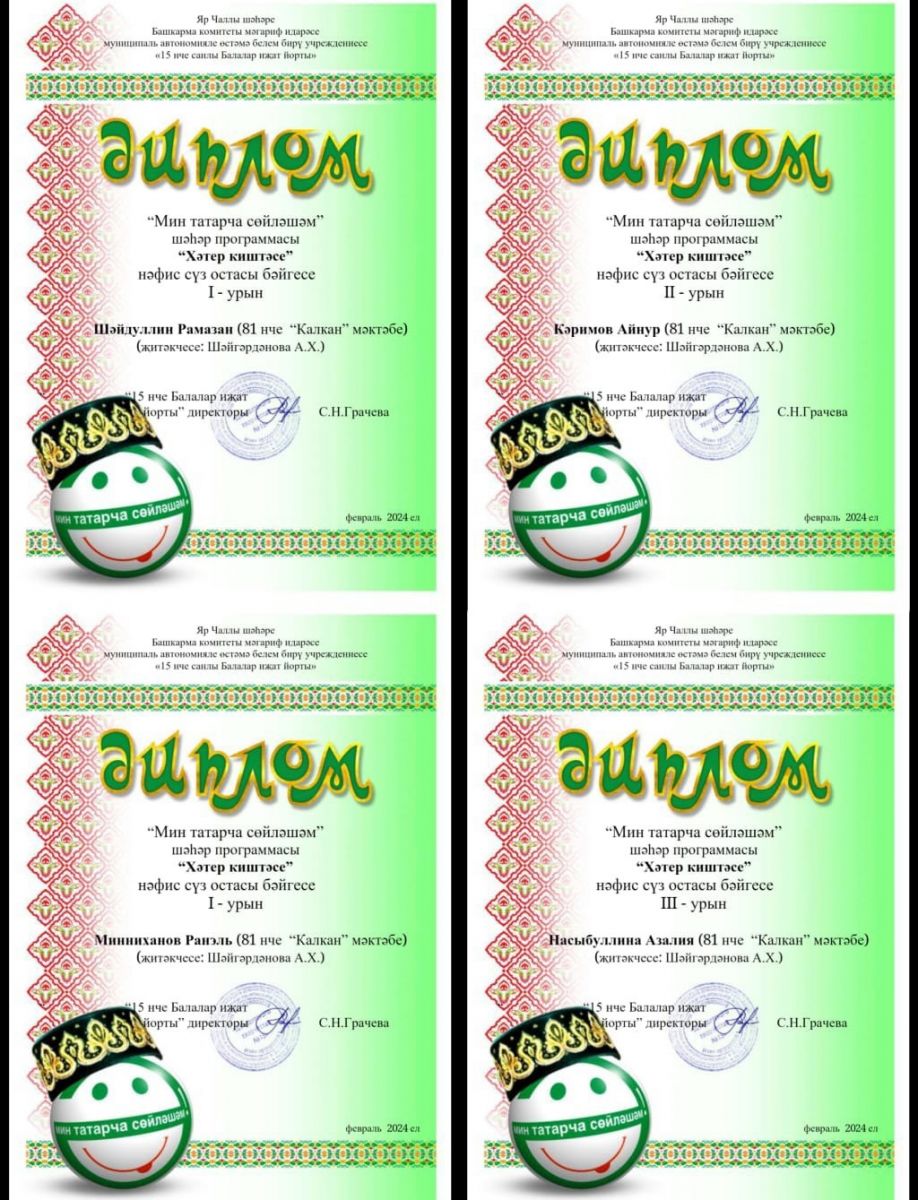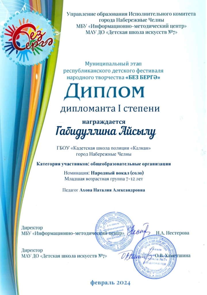 Поздравляем кадета 6 "Б" класса, Айсылу Габидуллину, с победой на Муниципальном этапе Республиканского детского фестиваля народного творчества.