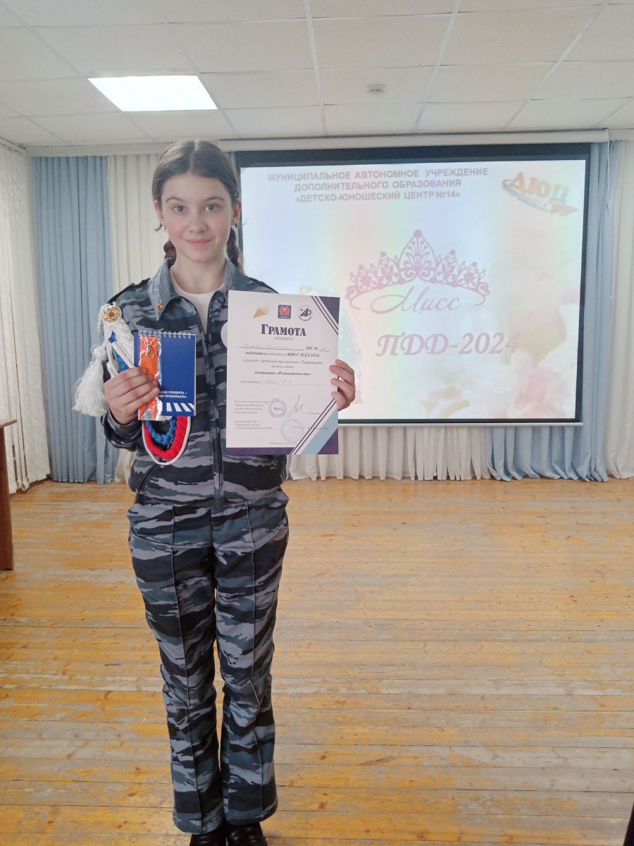 Виктория Волкова, кадет 5 "Б" класса, стала победителем в номинации "Мисс очарование" на городском конкурсе "Мисс ПДД".