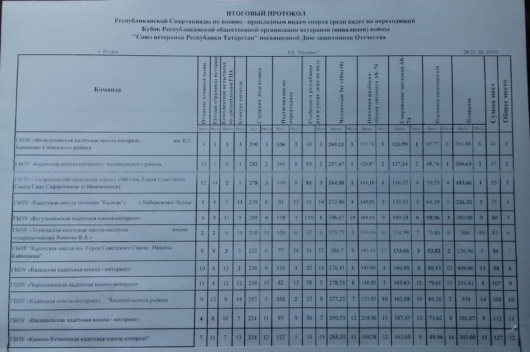Юбилейная Спартакиада по военно-прикладным видам спорта, которая собрала в Казани 150 кадет из Татарстан, объявлена закрытой. Здесь наши воспитанники в течение трех дней состязались в различных дисциплинах за переходящий Кубок Республиканской общественной организации ветеранов (инвалидов) войны «Союз ветеранов РТ». Они очень упорно работали над этим и результатом этого послужило занимаемое ими заслуженное 4 место среди 15 кадетских общеобразовательных организаций Татарстана! Наши поздравления!