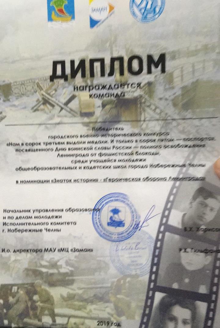 Учащиеся ГБОУ «КШП «Калкан» приняли участие в городском военно-историческом конкурсе «Нам в 43-м выдали медали и только в 45-м паспорта» на базе МАУ «КШП «МЦ «Заман», посвященный Дню воинской славы России - полного освобождения Ленинграда от фашистской блокады. Команда наших кадетов получили диплом «Знаток истории».