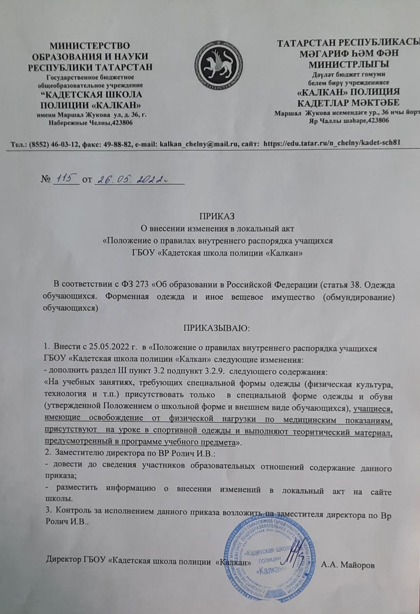 - Приказ о внесении изменений в локальный акт "Положение о правилах внутреннего распорядка учащихся"