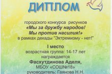 Поздравляем Фасхутдинову Аделю, ученицу 10А класса с Победой в городском конкурсе рисунков "Мы за дружбу народов! Мы против насилия!" в рамках декады "Экстремизму - нет!".