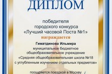 Поздравляем Гиматдинову Ильмиру, ученицу 10а класса, с победой в городском конкурсе "Лучший часовой Поста №1". Она награждена поездкой в г.Москва.