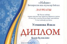 9А сыйныф укучысы Усманова Язиләне "Илһам" Бөтенроссия яшь язучылар бәйсенең лауреаты булуы белән тәбрик итәбез! Аңа яңадан-яңа иҗади уңышлар теләп калабыз! Афәрин!