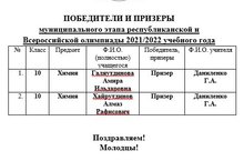 Победители и призеры муниципального этапа олимпиады по химии 08.12.2021