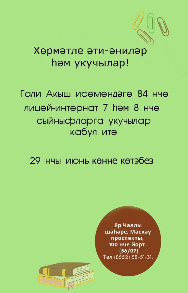 Муниципальное автономное общеобразовательное учреждение города Набережные Челны «Лицей-интернат №84 имени Гали Акыша» Республики Татарстан/Яр Чаллы шәһәренең "Гали Акыш исемендәге 84нче лицей-интернат" муниципаль автоном гомуми белем бирү учреждениесе