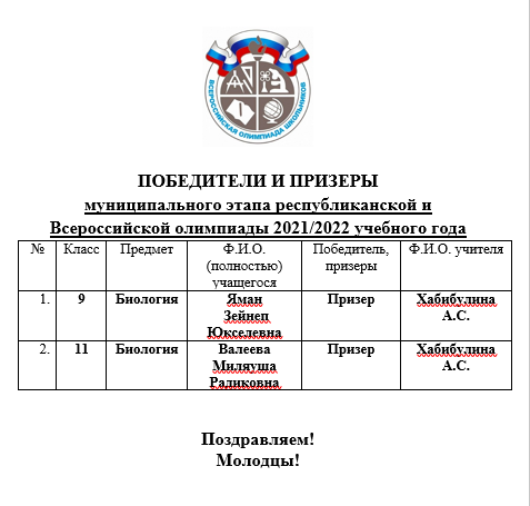 Победители и призеры муниципального этапа олимпиады по биологии