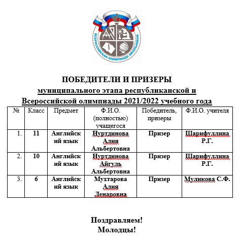 Победители и призеры муниципального этапа олимпиады по английскому языку