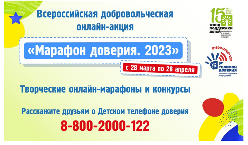 Опубликовано: 28.03.2023Уже 13 лет в России работает служба экстренной психологической помощи для детей и подростков. Телефон доверия 8-800-2000-122 — это бесплатная анонимная служба и один из важнейших проектов Фонда поддержки детей, находящихся в трудной жизненной ситуации. Ежедневно консультанты принимают сотни звонков, оказывают поддержку здесь и сейчас, а дети открыто говорят о том, что беспокоит. 17 мая празднуется Международный день Детского телефона доверия. К сожалению, далеко не все знают о существовании такой помощи. На смену повзрослевшим подросткам приходят новые юные абоненты, которые могут быть не знакомы со всероссийским проектом. Фонд поддержки детей, находящихся в трудной жизненной ситуации, совместно с Департаментом социального развития Тюменской области и партнерами в регионах организовали Всероссийскую добровольческую онлайн-акцию «Марафон доверия. 2023», которая пройдет с 28 марта по 28 апреля. Участников ждут интересные творческие онлайн-марафоны и конкурсы: фотоконкурс «Я знаю номер Детского телефона доверия», конкурс рисунков и масштабный флешмоб «Добрые дела». По итогам будет определен регион-победитель, жители которого наиболее активно включились в работу. Присоединяйтесь к акции в группе ВКонтакте (указать ссылку на вашу группу) и поддержите (здесь указать свою область) область!