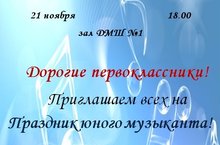 Приглашаем вас и ваших родителей на Праздник юного музыканта, который состоится 21 ноября, в пятницу, в 18.00. Ждём вас в зале Детской музыкальной школы № 1!