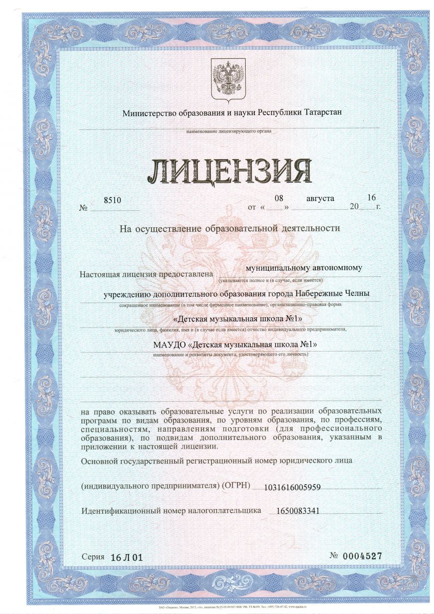Лицензия на осуществление образовательной деятельности 16Л01 № 0004527, регистрационный номер 8510 от 08.08.2016 г., действительна бессрочно