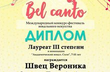 Выходные были очень плодотворными! Поздравляем участницу Международного конкурса-фестиваля вокального искусства "Bel canto" Швец Веронику, которая стала лауреатом III степени. От всей души поздравляем ее преподавателя Шишкину Анну Анатольевну и концертмейстера Газизову Марину Андреевну!!