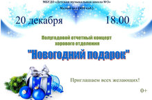 20 декабря в 18.00 состоится полугодовой отчетный концерт хорового отделения "Новогодний подарок". Будем рады видеть всех!