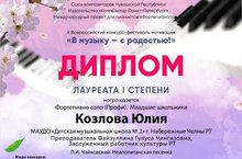 Поздравляем Козлову Юлию и её преподавателя Заслуженного работника культуры РТ Файзуллину Гулусу Чингизовну с победой во II Всероссийском конкурсе-фестивале мотивации "В музыку - с радостью!"