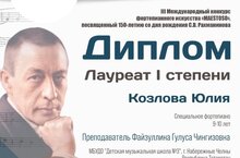 Поздравляем Козлову Юлию и её преподавателя Заслуженного работника культуры РТ Файзуллину Гулусу Чингизовну с победой на III Международном конкурсе фортепианного искусства "MAESTOSO", посвящённом 150-летию со дня рождения С.В.Рахманинова. Молодцы! Желаем новых творческих успехов!