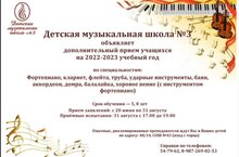 ПРИХОДИТЕ К НАМ УЧИТЬСЯ! 07.07.2022 Детская музыкальная школа № 3 объявляет набор учащихся на новый 2022-2023 учебный год. тел. учебной части - (8552) 54-79-62 Прием заявлений: с 20 июня по 31 августа Приемные испытания: 31 августа с 17.00 до 19.00 Ждём Вас и Ваших детей по адресу: 48/14, СОШ №43 (вход с торца)