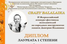 Поздравляем Афзалову Марину Витальевну, Бахтиярову Эльмиру Анасовну и Сафину Гузель Азатовну с достойным результатом воспитанников на II Всероссийском конкурсе-фестивале исполнителей на народных инструментах памяти Дмитрия Калинина.