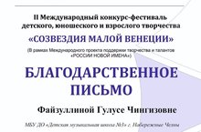 Поздравляем Козлову Юлию и её преподавателя Заслуженного работника культуры РТ Файзуллину Гулусу Чингизовну с победой на II Международном конкурсе-фестивале детского, юношеского и взрослого творчества "СОЗВЕЗДИЯ МАЛОЙ ВЕНЕЦИИ".