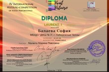 Поздравляем Балаеву Софию и её преподавателя Малюта Марину Павловну с Победой в IV Международном фестивале-конкурсе "Vivat Virtuoso", который прошел на базе Детской школы искусств им. В. С. Калинникова в г.Москва.