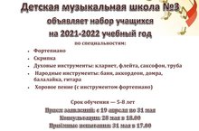 Детская музыкальная школа № 3 объявляетнабор учащихсяна новый 2021-2022 учебный год.тел. учебной части - (8552) 54-79-62Прием заявлений: с 19 апреля по 31 маяКонсультации: 28 мая в 18.00Приемные испытания: 31 мая в 17.00Ждём Вас и Ваших детей по адресу: 48/14, СОШ №43 (вход с торца) -