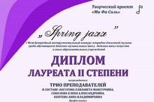 Поздравляем Соколову Елену Александровну и её воспитанников по классу импровизации с успешным участием в I Международном инструментальном конкурсе эстрадно-джазовой музыки среди обучающихся в ДМШ, ДШИ и иных образовательных учреждений "Spring jazz" в г.Санкт-Петербург.