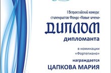 ПОЗДРАВЛЯЕМ Цапкову Марию (ДМШ N3, преподаватель Малюта Марина Павловна) со званием ДИПЛОМАНТА I ВСЕРОССИЙСКОГО КОНКУРСА СТИПЕНДИАТОВ ФОНДА «НОВЫЕ ИМЕНА»!