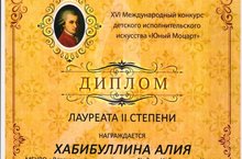 Поздравляем Файзуллину Гулусу Чингизовну и её воспитанницу Хабибуллину Алию с успешным участием в XVI Международном конкурсе детского исполнительского искусства "Юный Моцарт" в г.Пермь.